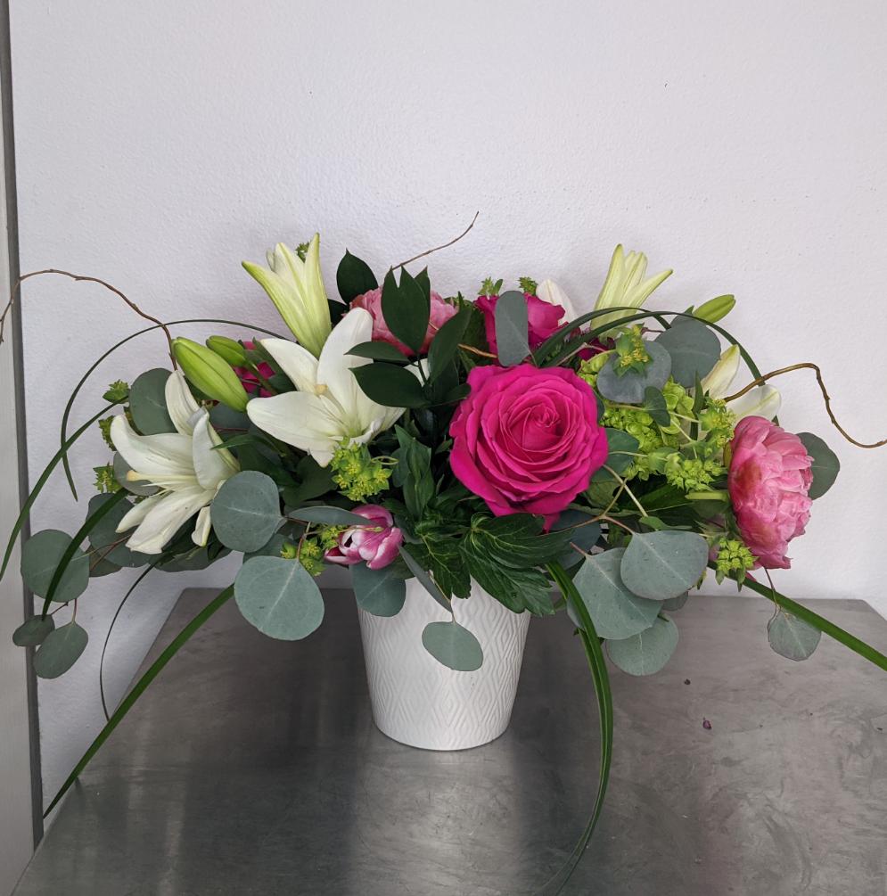 Lush Love is a beautiful garden styled arrangement sure to put a smile on their face! Fresh roses, lilies, and seasonal blooms perfect for any occasion.