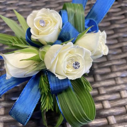 Mystic Sea wrist corsage features white roses, textured greens, rhinestones, and a beautiful blue ribbon.