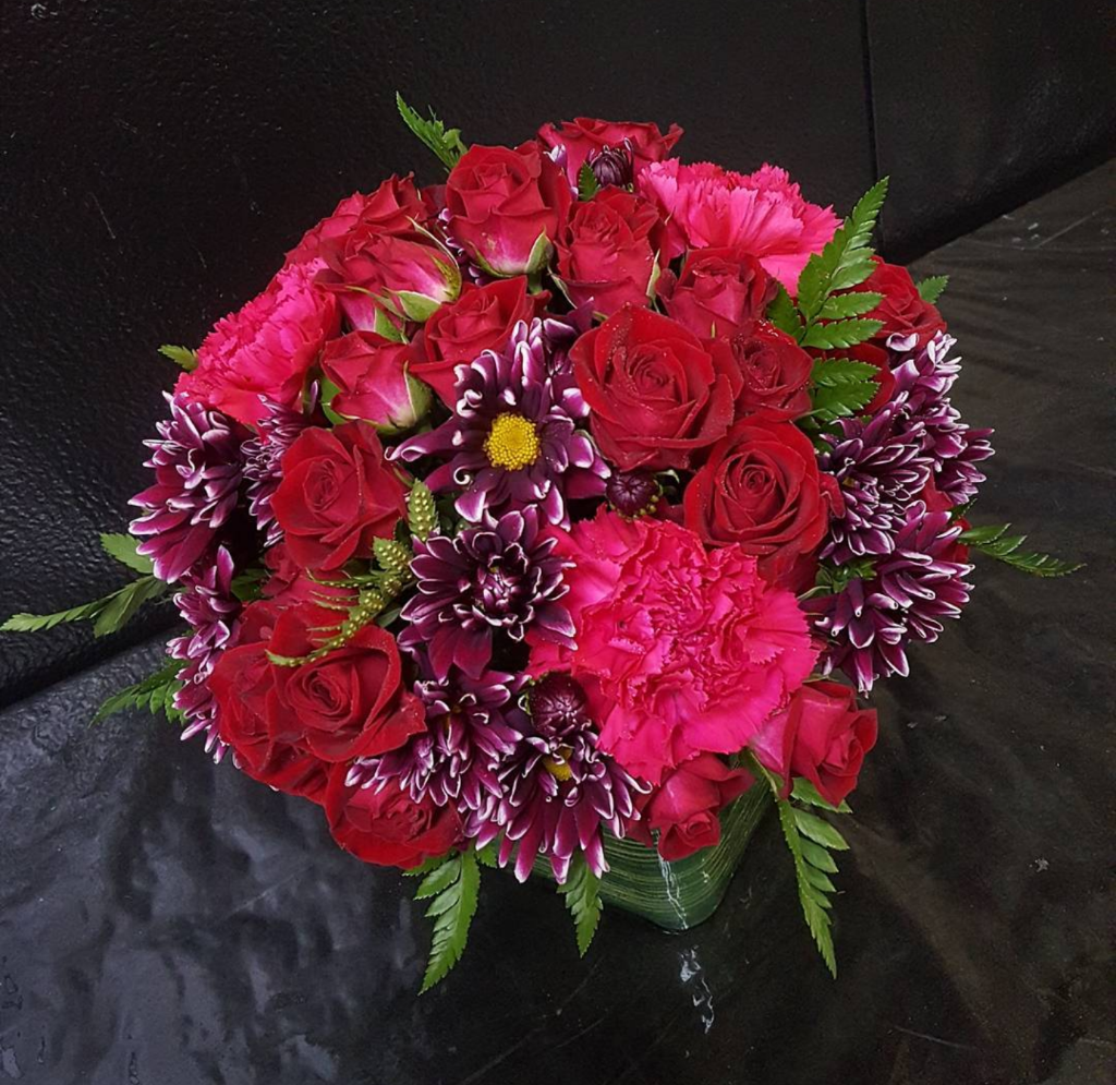 Royal Romance is a gorgeous arrangement offered in deep tones like reds and purples sure to portray romantic feelings. Perfect for an anniversary or an I love you. Flowers and containers will vary.