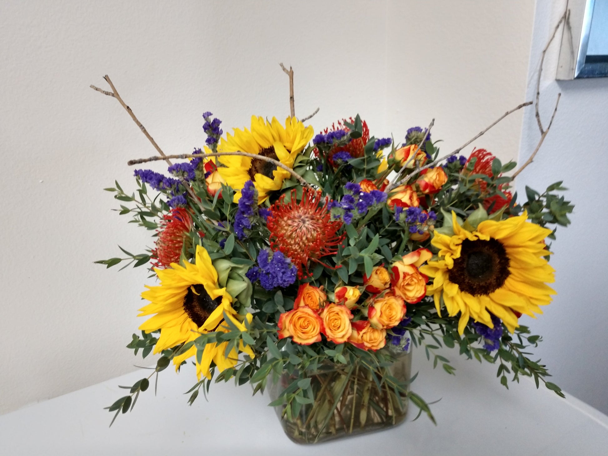 Summer in Bloom is a textural sunflower and protea arrangement. It features beautiful vibrant colors that are sure to make a statement!