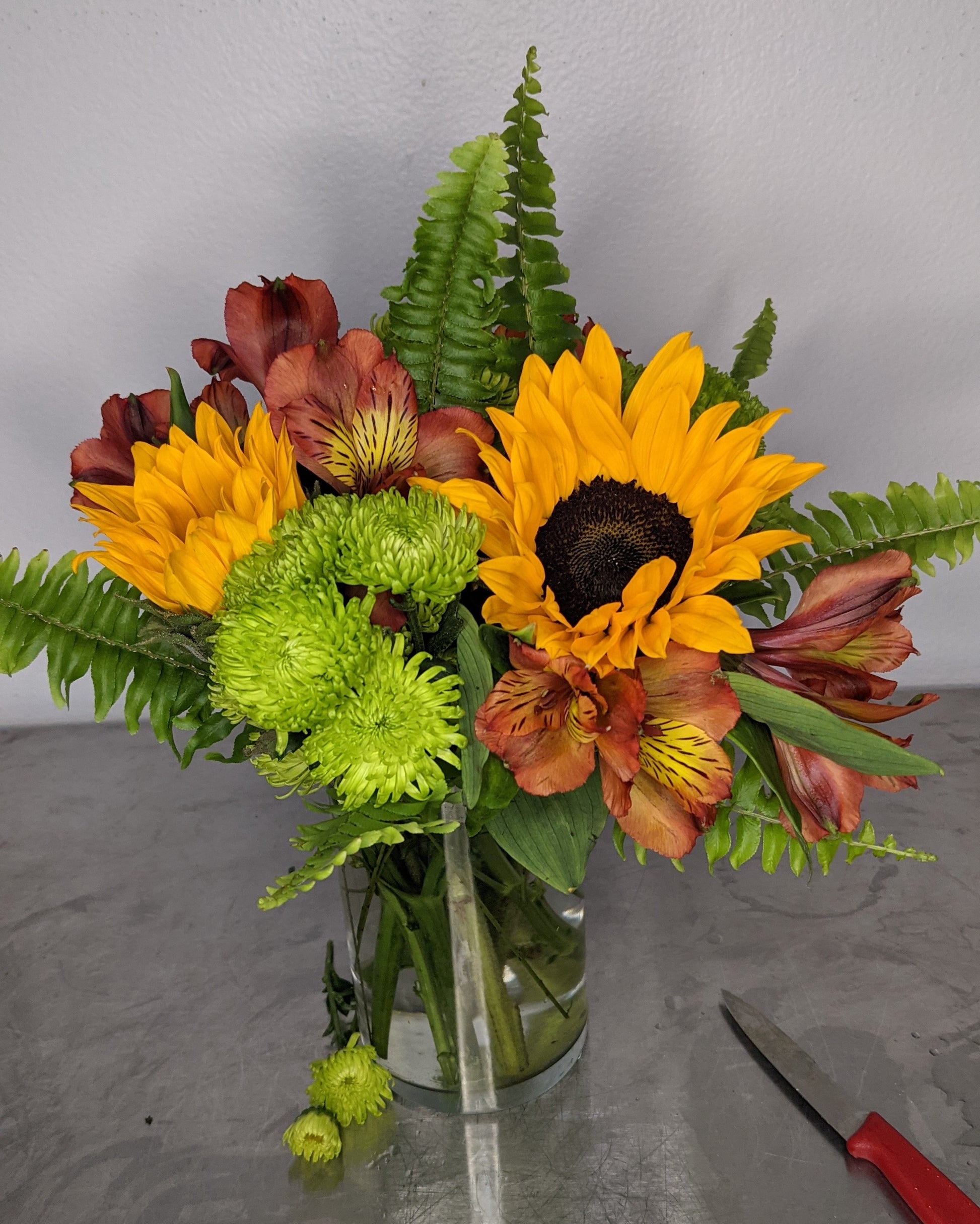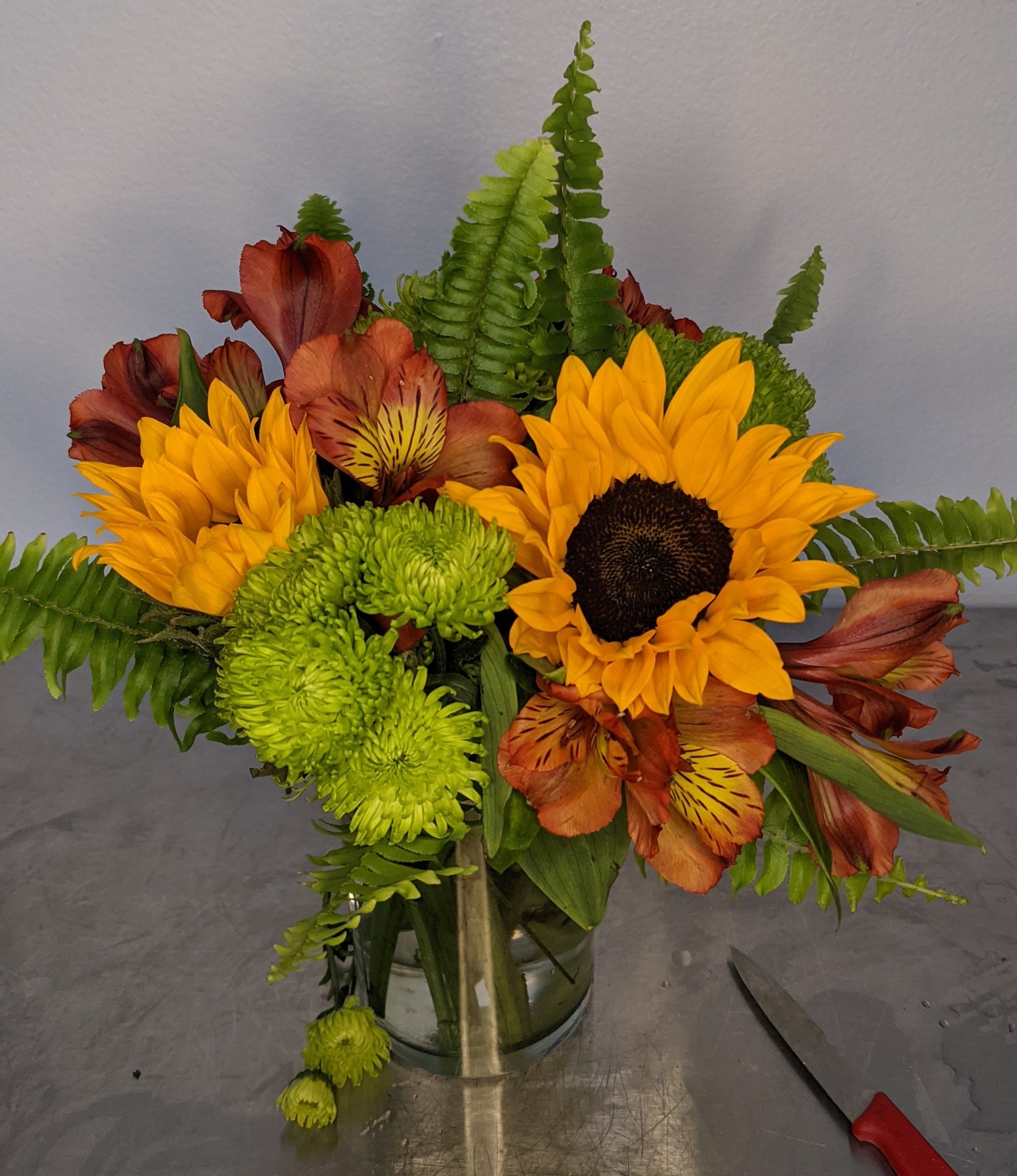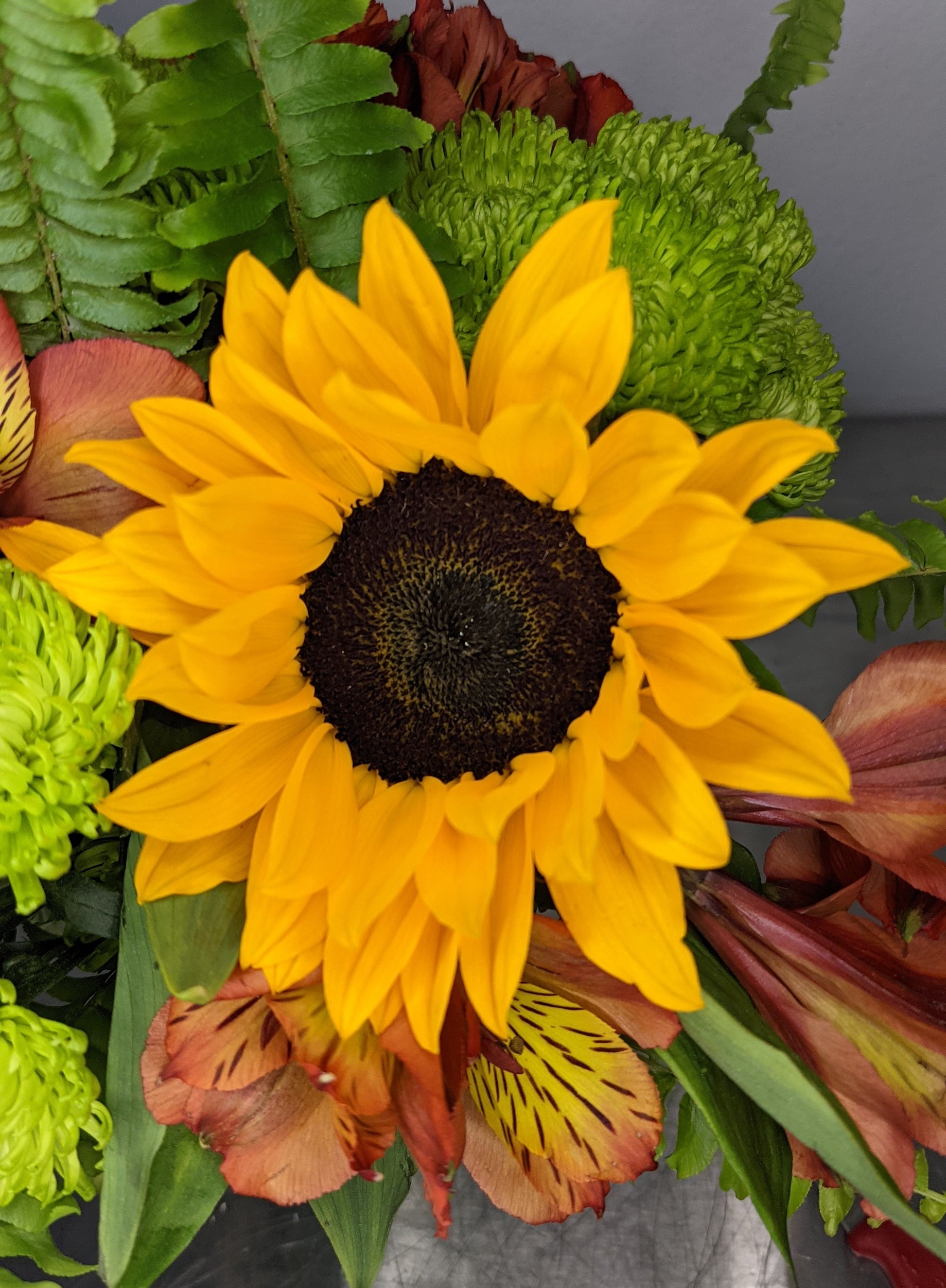 The Sunrise is a fun and cheery bouquet featuring sunflowers, alstromeria, daisy poms, and ferns.